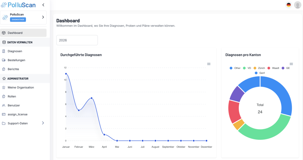 Mit PolluScan können Schadstoffdiagnostiker alle ihre Arbeitsabläufe verwalten – von der Verwaltung der Diagnosen über die Auftragsverwaltung an die Labore bis hin zur Erstellung von Berichten.